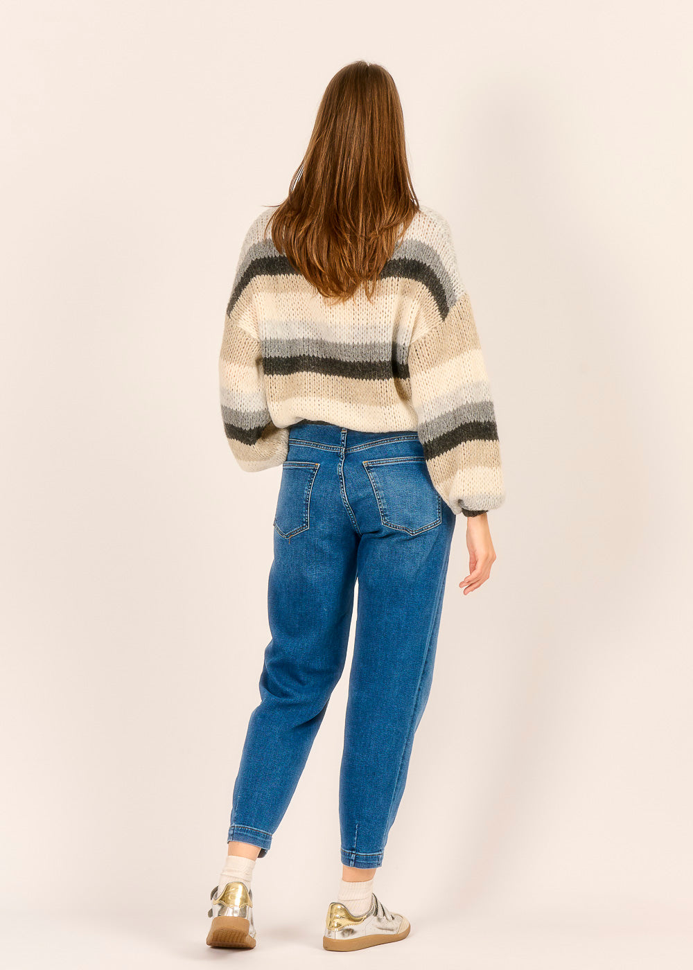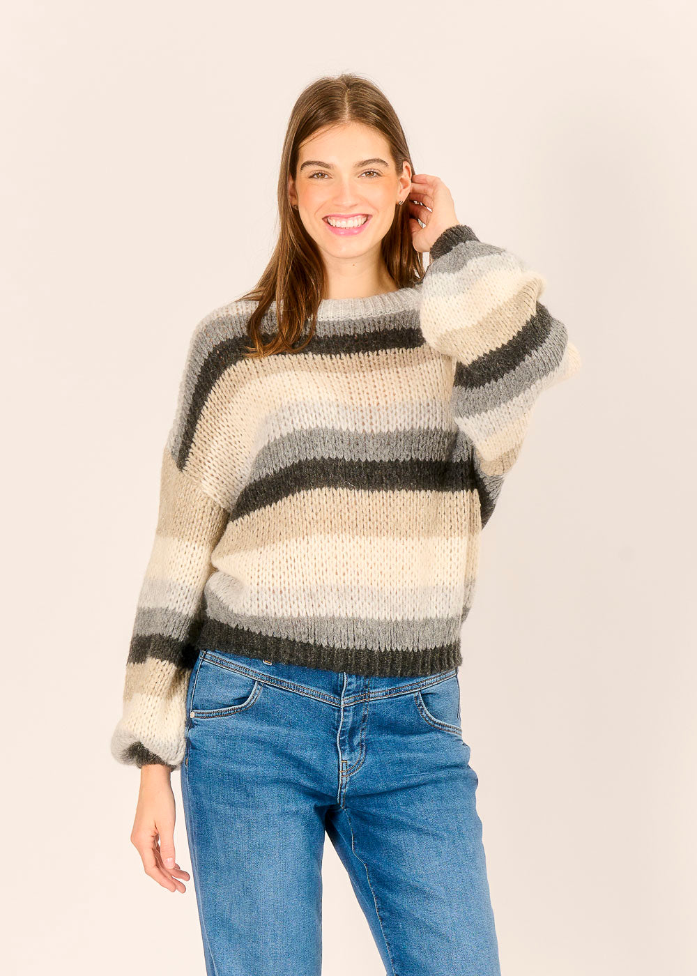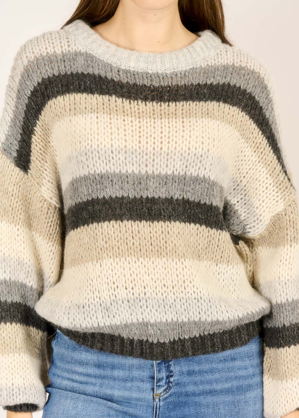 Dieser flauschige Ringelpullover ist das ultimative Kuschel-Statement für kühle Tage und vereint Komfort mit modernem Design. Die harmonische Farbkombination aus warmen Beige-, Grau- und Cremetönen macht das grobe Strickmuster zu einem stilvollen Hingucker. Der lockere Schnitt und das luxuriöse Tragegefühl machen ihn zum perfekten Wohlfühl-Piece, das jeder Jeans sofort lässigen Chic verleiht.